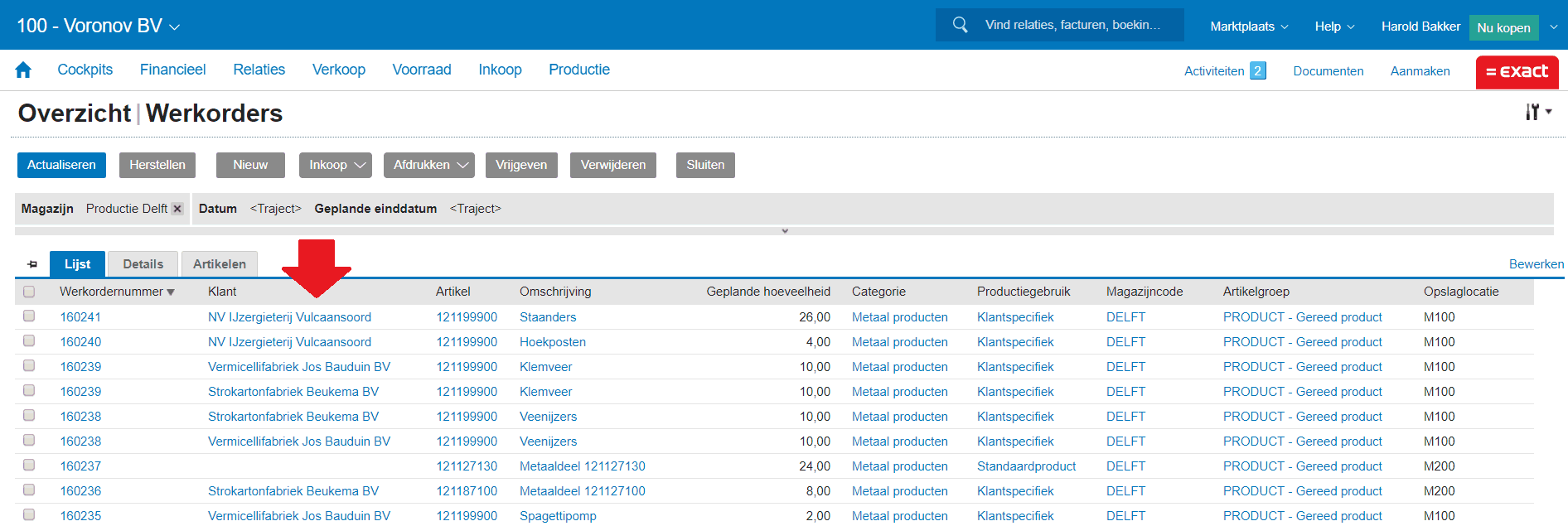 Klantnaam in het werkorderoverzicht in Exact Online