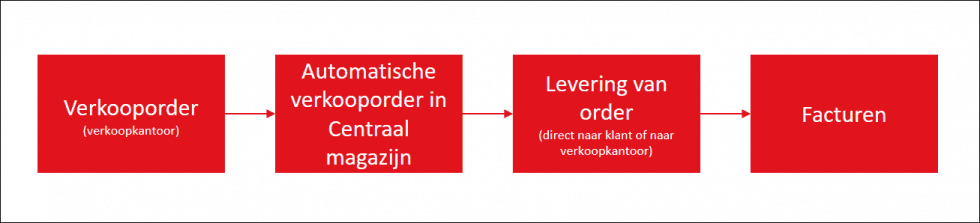 Een verkoopkantoor (al dan niet voorraadhoudend) registreert een verkooporder in zijn eigen administratie. Vervolgens zal er voor deze verkooporder automatisch een verkooporder in de administratie van het centrale magazijn worden aangemaakt. Hierna kan de order worden geleverd. Je kunt ervoor zorgen dat de order direct aan de klant wordt geleverd, of dat de producten aan het verkoopkantoor worden geleverd. Het verkoopkantoor factureert vervolgens naar de klant.
