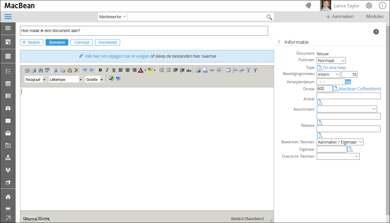 Nadat je op het betreffende type hebt geklikt kom je op de document editor pagina terecht. Hier kun je onder andere de titel van het document definiëren, bijlagen toevoegen en uiteraard het document vullen met inhoud. Aan de rechterkant kun je extra informatie meegeven aan het document